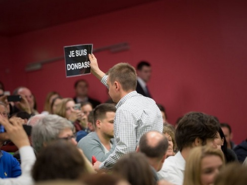 Одна девушка бросила Порошенко по-английски: "Не хочу слушать человека, который убивает детей!". Собравшиеся поддержали её аплодисментами. Также многие студенты пришли в зал с табличками "Я Донбасс".