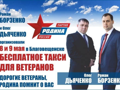Активисты амурского регионального отделения партии "РОДИНА" Олег Дьяченко и Роман Борзенко организовали 8 и 9 мая услуги бесплатного такси для ветеранов Великой Отечественной войны. Условия поездок таковы: нужно позвонить в службу такси по телефону 515-515, приехавшему водителю предъявить удостоверение ветерана Великой Отечественной, и можно в любое время с 08:00 до 20:00 ехать в любое место в пределах города. В условиях обозначено, что если с ветераном будет сопровождающий, он едет также бесплатно.