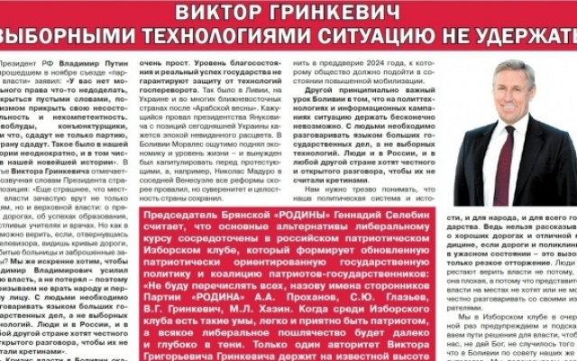Председатель Брянской «РОДИНЫ» Геннадий СЕЛЕБИН считает, что основные альтернативы либеральному курсу сосредоточены в российском патриотическом Изборском клубе, который формирует обновленную патриотически ориентированную государственную политику и коалицию патриотов-государственников: «Не буду перечислять всех, назову имена сторонников Партии «РОДИНА» А.А. Проханов, С.Ю. Глазьев, В.Г. Гринкевич, М.Л. Хазин. Когда есть такие умы, легко и приятно быть патриотом, а всякое либеральное пошлячество будет далеко и глубоко в тени.