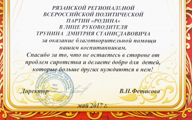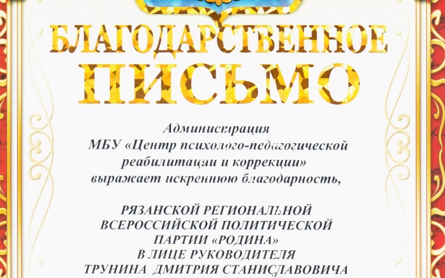 За участие в ряде мероприятий, проводимых Центром психолого-педагогической реабилитации и коррекции, "РОДИНЕ" была объявлена благодарность.