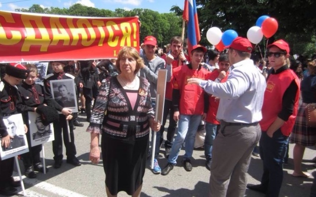 К многолюдной колонне молодых партийцев примкнула колонна регионального отделения "Союза казаков России", их объединял транспарант со словами адыгейского журналиста, Героя Советского Союза Хусена Борежевича Андрухаева - "Русские не сдаются".