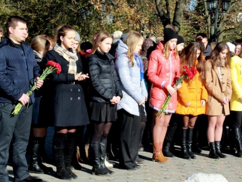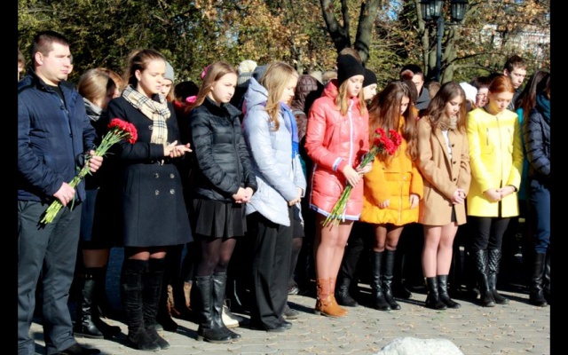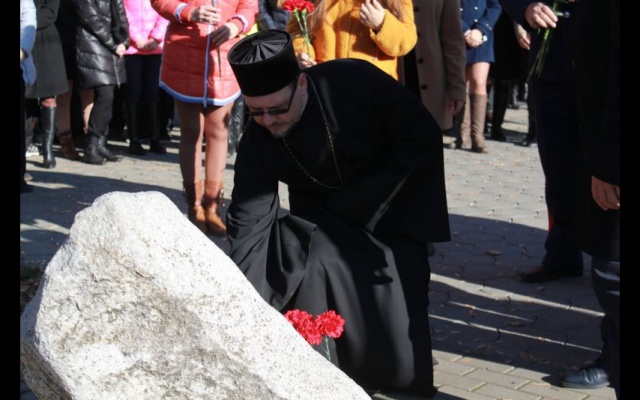 После минуты молчания участники митинга возложили цветы к памятному камню.