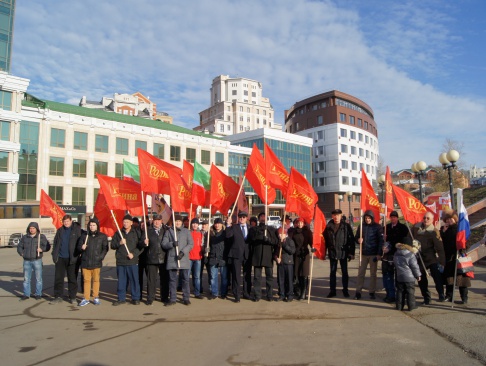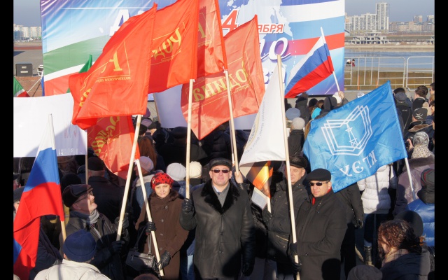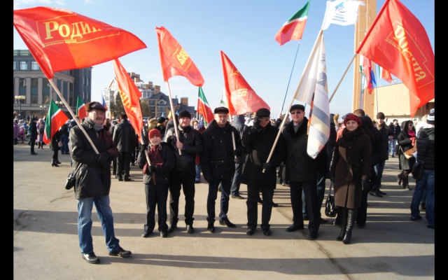 К 11 часам утра к памятнику Вахитову начали стекаться группы патриотов, многие - с флагами партии. Также присутствовали активисты Добровольческого движения особого назначения. Эта организация очень тесно связана с партией "РОДИНА": она активно выступает в поддержку армии, флота и оборонно-промышленного комплекса России. Были также флаги Российской Федерации и Татарстана.